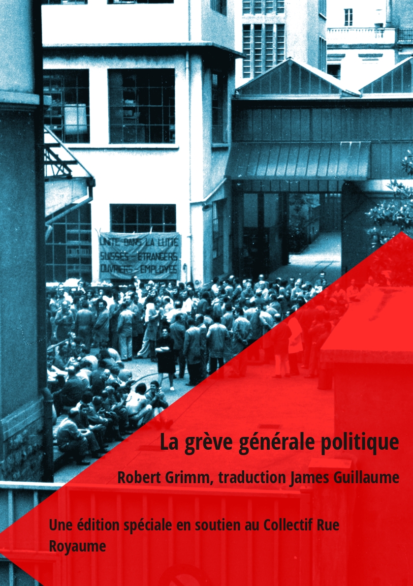 En soutien à cette action d'occupation, Le Silure a édité un texte datant de plus d'un siècle, accompagné d'un commentaire original. Il s'agit de La grève générale politique (Der politische Massenstreik) de Robert Grimm dans la traduction qu'en a donnée James Guillaume dans La Voix du peuple, un journal syndicaliste révolutionnaire romand du début du XXe siècle. Un texte trop méconnu et dont le contenu convient fort bien au soutien d'une action directe comme celle menée par le collectif Rue Royaume.
